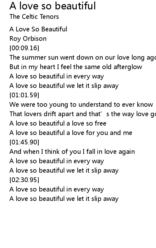 It was kinda hard to understand the english . The summer sun looked down / on our love long ago / but in my heart i feel / the same old afterglow / a love so beautiful / in . Discover short videos related to a love so beautiful lyrics on tiktok. A love so beautiful lyrics: Roy orbison, jeff lynne lyrics powered by www.musixmatch.com